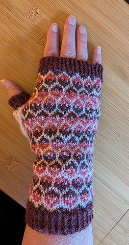 I finished my test. These are the Exmoor Mittens by Simone Bechtold and is a paid for pattern that you can find on Ravelry. I really enjoyed making these, however, I found that the thumbs for me were a challenge. I couldn't get my tension right. This was no fault of the pattern, but my lack of experience carrying longer floats. I used Kroy 3ply yarn in the colorways Burgundy Mix, Rose and Pink. Finished May 15, 2025.