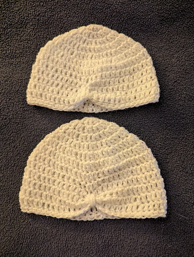 My third and fourth finishes were baby hats. These sweet hats were made from the Turban Newborn Hat pattern. This is a free pattern and can be found on the Cream of the Crop website. I used an unknown acrylic fingering from my stash. The top hat was made using a 3.5mm hook and the bottom hat was made using a 3.75mm hook. Finished September 23, 2025.