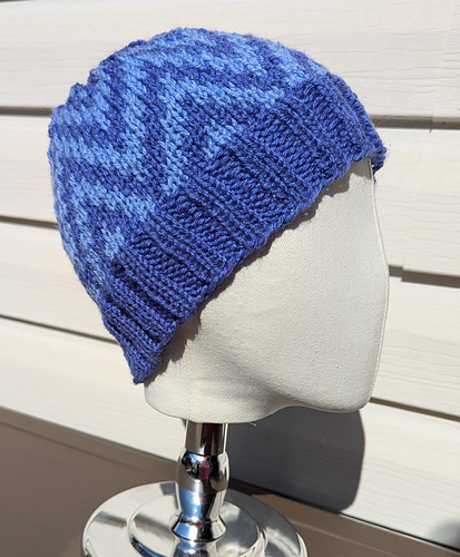 Number 6 was another fun knit found free on the Knitting With Schnapps website. This hat was designed by Robin Celli and is called Chevron Chic. Robin heads the Delaware Head Huggers. This is a great group that helps those with cancer. I used the leftover periwinkle and unknown blue for this hat. Finished September 26, 2025.