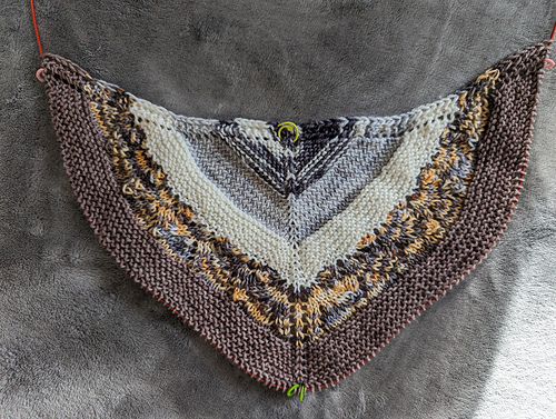 There's not else much to report for finishes last month. I've done some work on my Grand Opening Shawl. This is a paid for pattern. It was a KAL from last year's Advent, but I ran a mistake and put it aside, since I couldn't find it. That aside lasted almost a year. How does that happen? Anyhow, this was the last photo taken. I had done more with the change in directions, but never photographed it. Here are parts 1-5. I had completed all the way to part 13 and needed to fix things.
